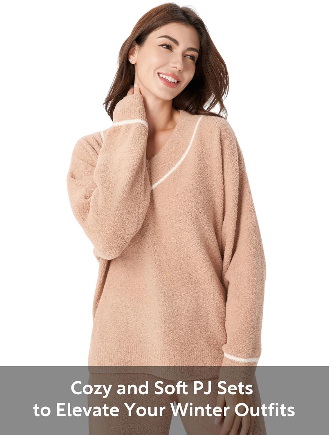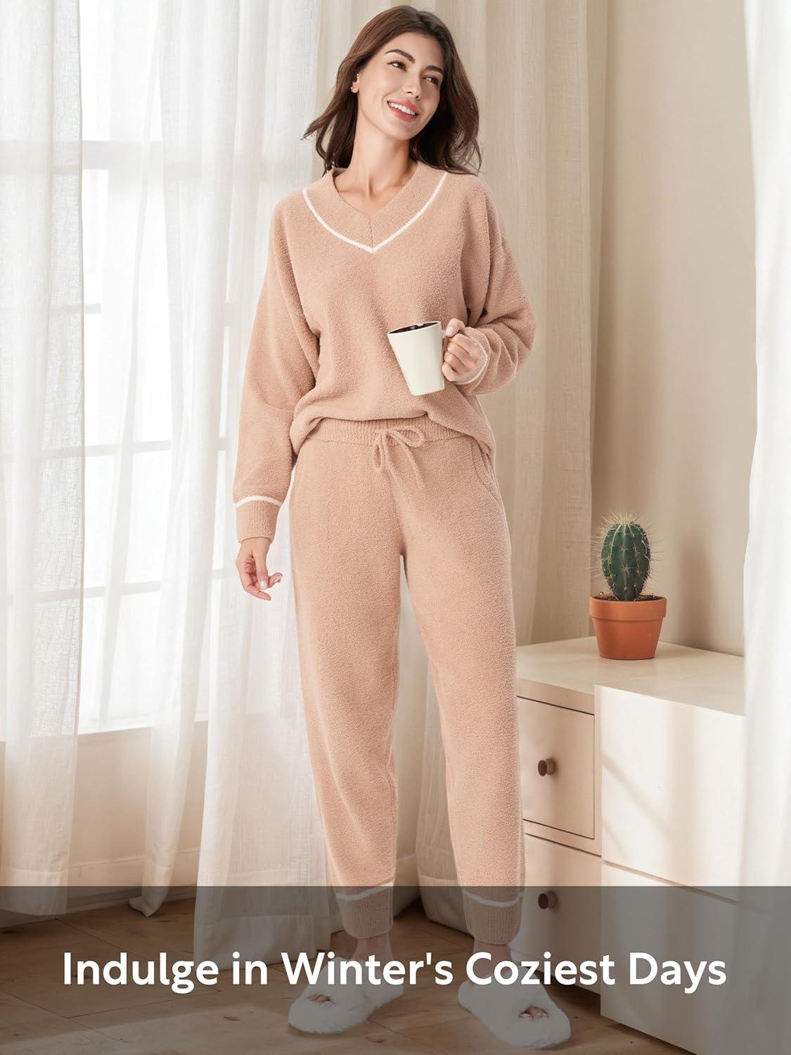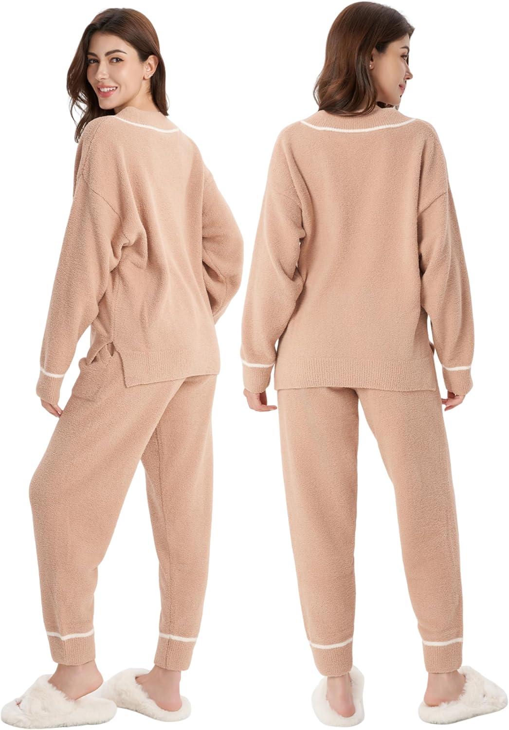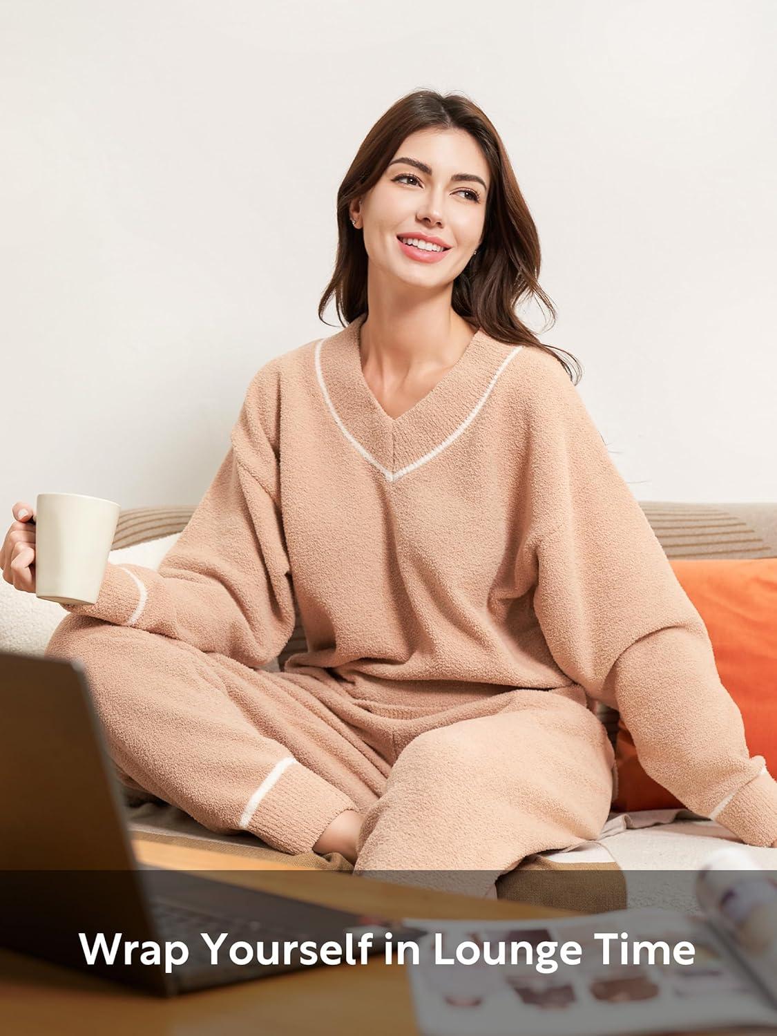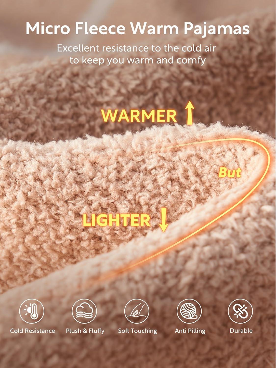 DAVID ARCHY Fleece Pajamas for Women Warm Fuzzy Winter Cozy Soft Comfy Long Sleeve 2 Peices Pj Sets Sleepwear Loungewear(V-light Brown)