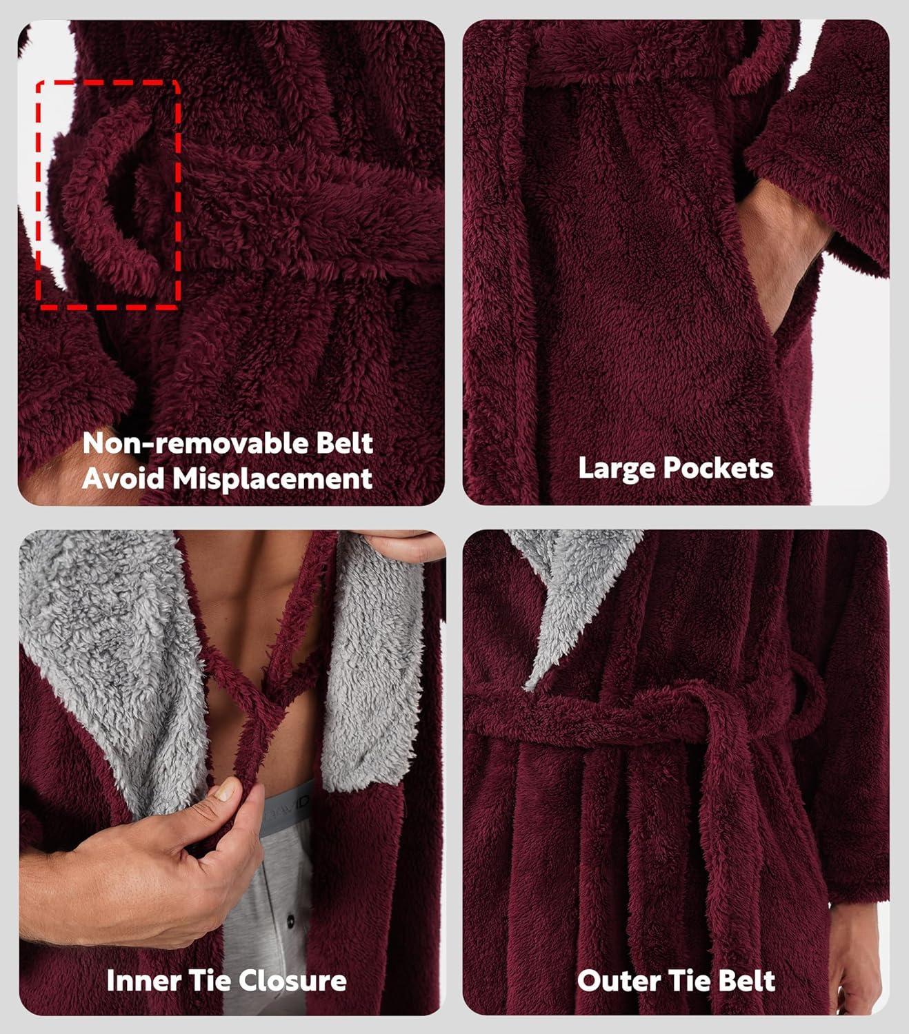 DAVID ARCHY Men's Hooded Robe Soft Coral Fleece Microfiber Bathrobe(A5 Red- Shu Velveteen)