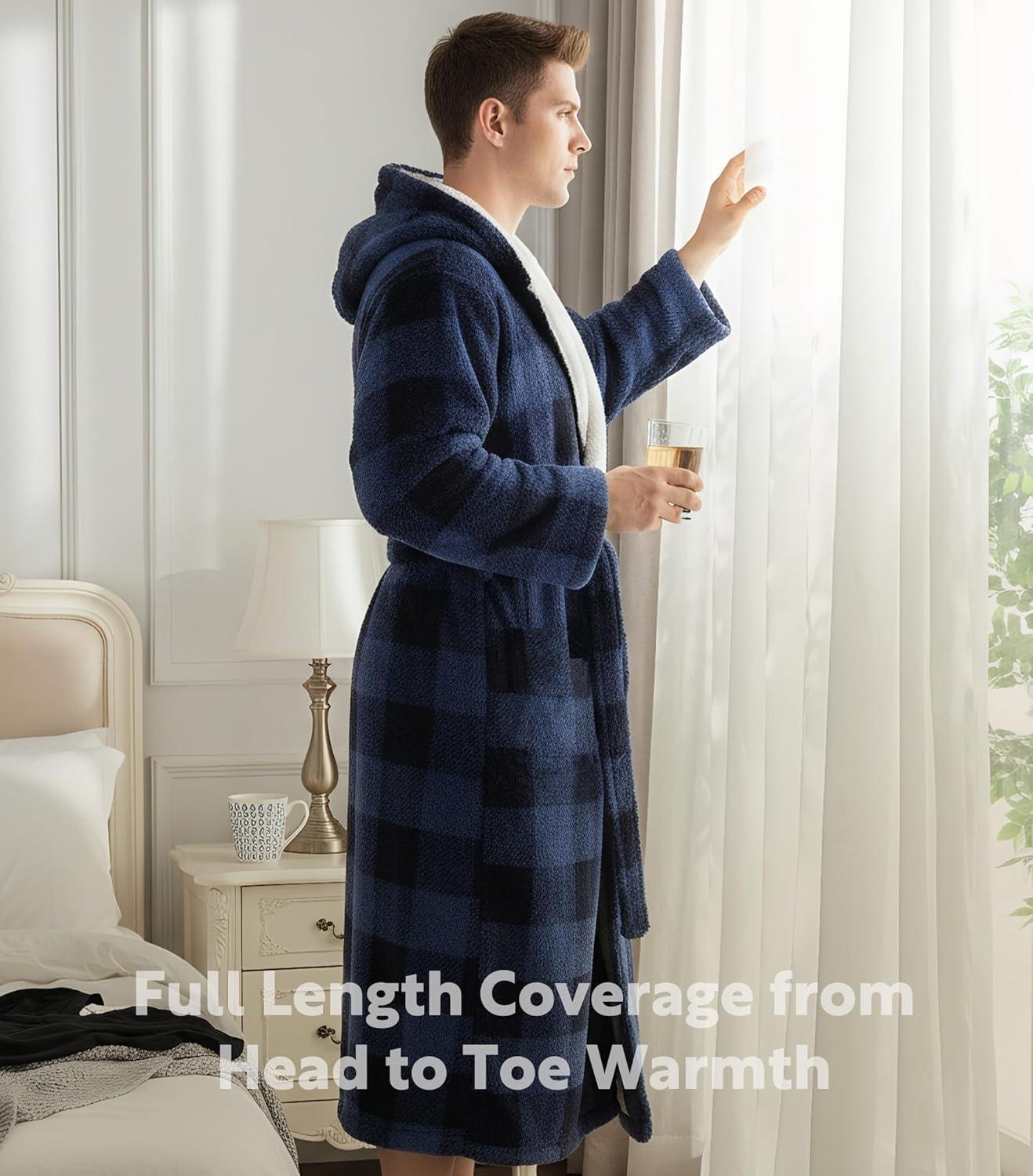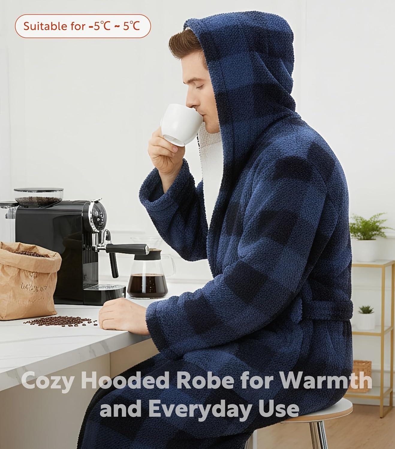 DAVID ARCHY Men’s Hooded Robe Soft Coral Fleece Microfiber Bathrobe(A9 Blue Grey Check)