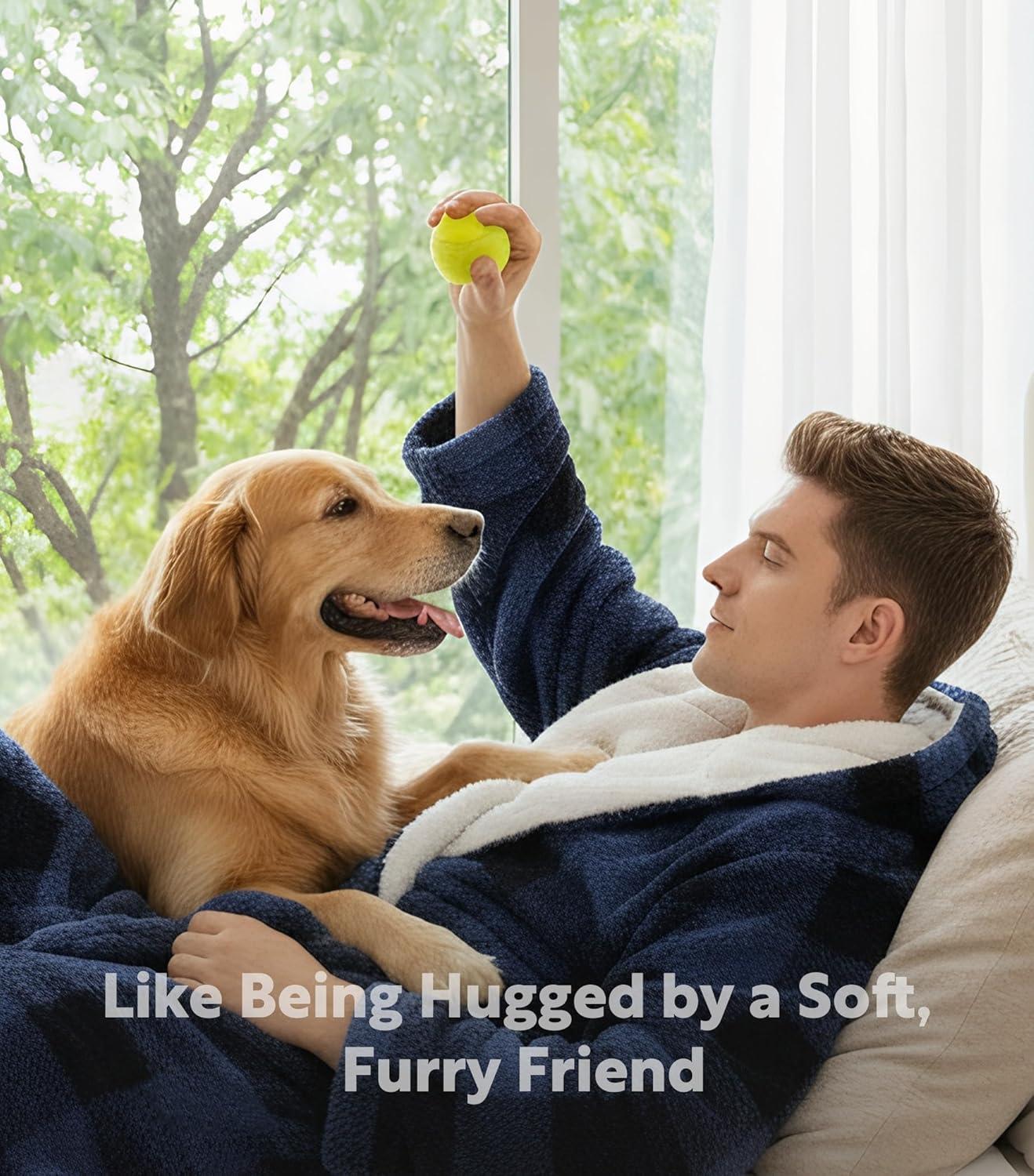 DAVID ARCHY Men’s Hooded Robe Soft Coral Fleece Microfiber Bathrobe(A8 Blue Check)