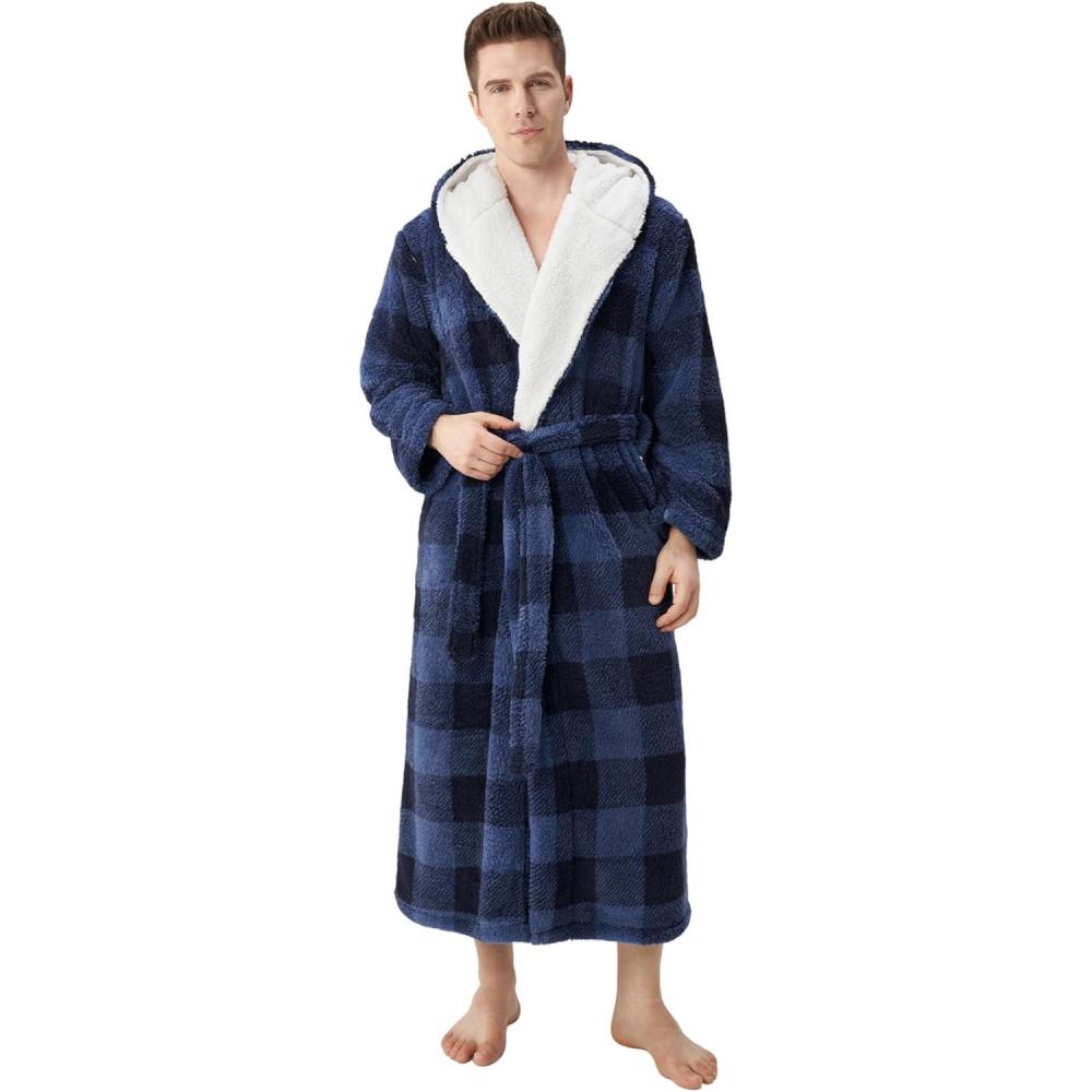 imageDAVID ARCHY Mens Hooded Robe Soft Coral Fleece Microfiber BathrobeA9  Blue Grey Check