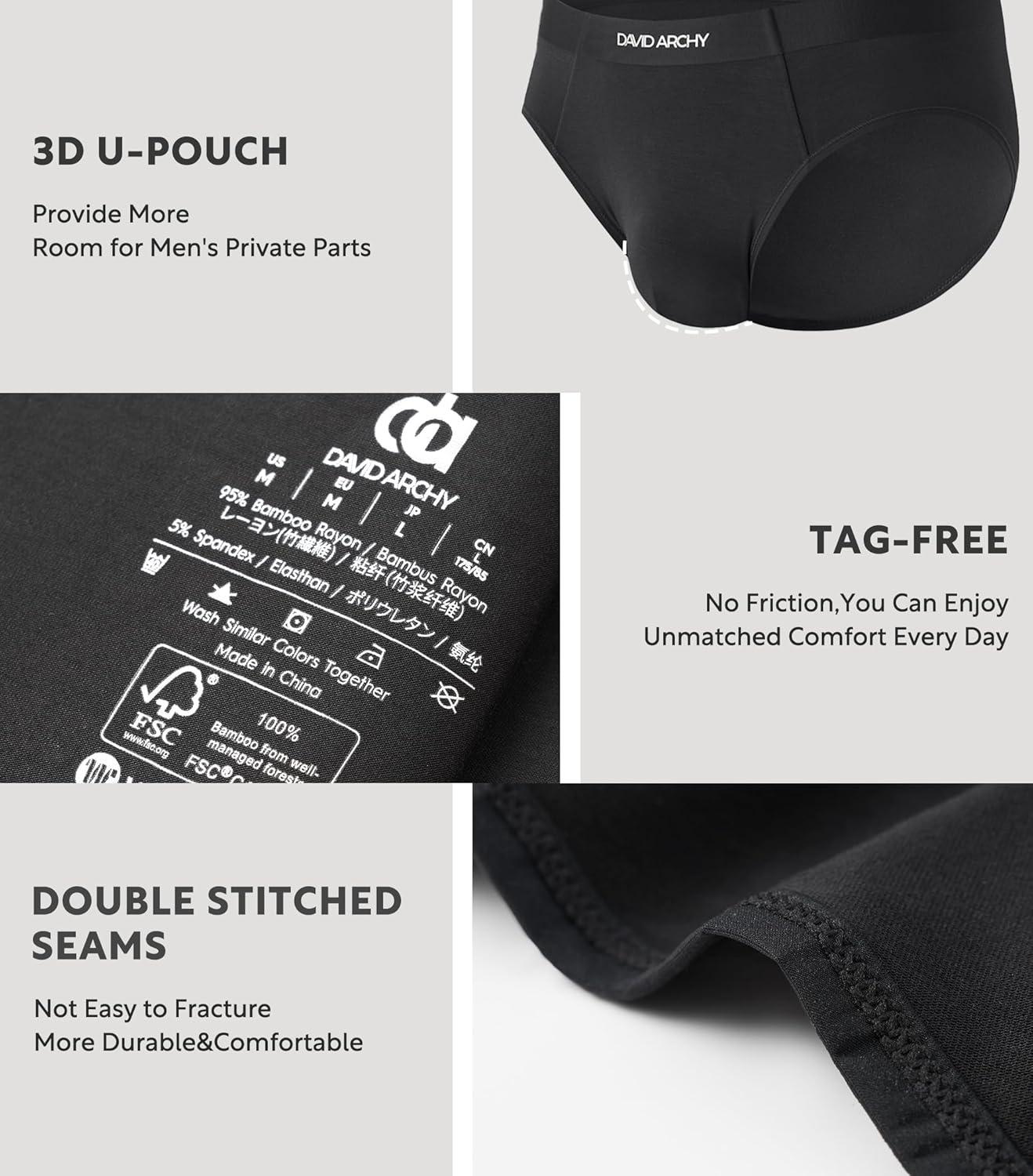 DAVID ARCHY Men's Seamless Bamboo Rayon Briefs, Breathable Soft Underwear with No-Fly Pouch 4-Pack(Black)