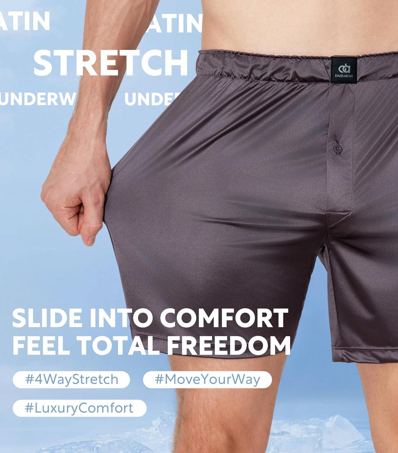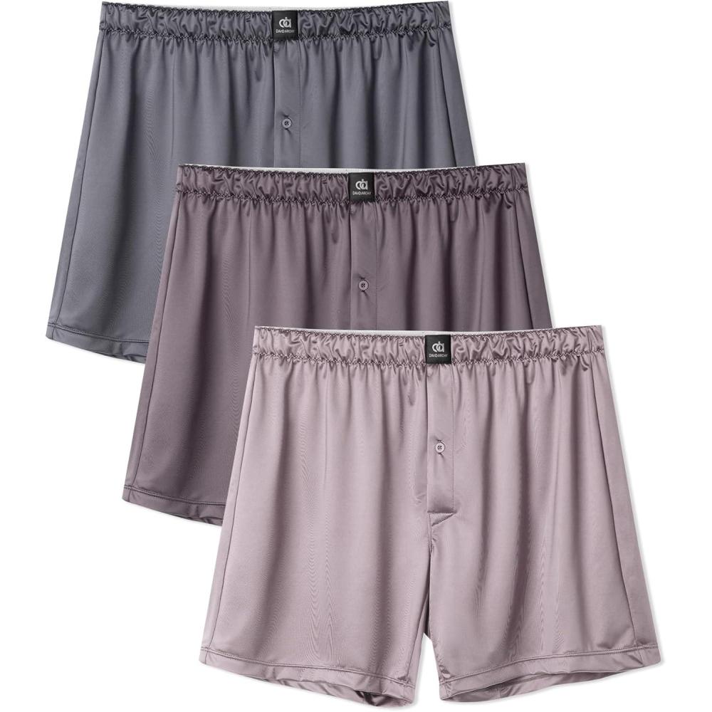 DAVID ARCHY Stretch Satin Boxers for Men, Silk Feeling Boxer Shorts, Breathable Loose Men’s Underwear for Sleep 3 Pack(Dark Gray/Dark Purple/Grayish Purple)