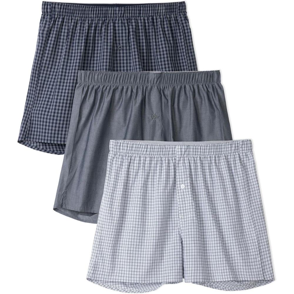 DAVID ARCHY Woven Cotton Boxers for Men Classic Men's Underwear Loose Breathable & Comfortable Boxer Shorts 3 or 5 Pack(Navy Gingham Checks / Solid Slate Gray / Light Blue Microchecks)